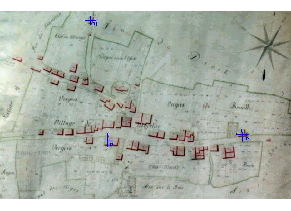 1822 - Themen: Pläne Movelier; Quelle: Archiv Movelier Dok. Typ: Pläne Die 3 blaue Punkte wurden angegeben als Referenzpunkte für den Kartenvergleich