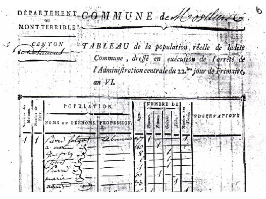 1798 - Census (an VI) Thèmes: Source: AAEB MT361 Christ Salgat émigrera en 1852 vers les Etats-UnisPierre Salgat restera à Movelier